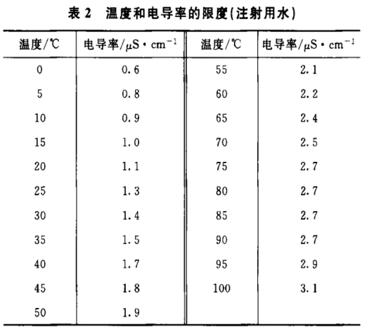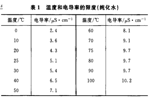 純化水可使用在線或離線電導(dǎo)率儀,記錄測(cè)定溫度。在表1中,測(cè)定溫度對(duì)應(yīng)的電導(dǎo)率值即為限度值。如測(cè)定溫度未在表1中列出:則應(yīng)采用線性內(nèi)插法計(jì)算得到限度值。如測(cè)定的電導(dǎo)率值、不大于限度值,則判為符合規(guī)定;如測(cè)定的電導(dǎo)率值大于限度值,則判為不符合規(guī)定